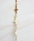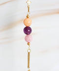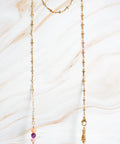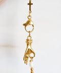 DESCRIZIONE:Collana maglia di croci lunga, effetto doppia catena; con dettagli alle estremità: ciondolo a forma di mano con madreperla pendente e tre pietre naturali colorate: viola, arancione e rosa.