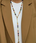 DESCRIZIONE:Collana handmade a forma de Y con pietre naturali colorate: verde, cipria, rosso, viola, rosa e bianco latte; con dettaglio finale di corno e pietra rosa centrale.