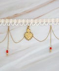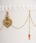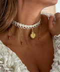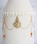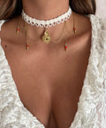 DESCRIZIONE: Collana handmade girocollo con elaborazioni macrame e dettagli frontali: Al centro ciondolo a forma di cuore; ai lati pendenti a maglia semplice che scendono ad arco, ciascun estremo termina con una collanina pendente e un ciondolo con pietra arancione.