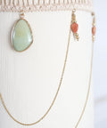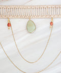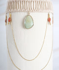 DESCRIZIONE: Collana handmade girocollo con elaborazioni macrame e dettagli frontali: Al centro maxi ciondolo in pietra naturale di Calcite; ai lati, due ciondoli in pietra naturale di Corniola, da cui pendono catene di maglia semplici che si estendono e si collegano tra loro.