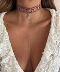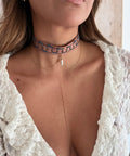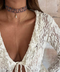 DESCRIZIONE: Collana handmade girocollo con dettagli frontali: Al centro ciondolo madre perla a forma croce e collana pendente; ai laterali, bis maglia semplice che si collega al ciondolo centrale