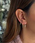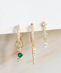 DESCRIZIONE:Tris orecchini singoli: Orecchini a cerchio con dettaglio frontale di zirconi e ciondolo pendenti di tris zirconi, al centro zircone verde, orecchini a cerchio con dettaglio frontale di zirconi e ciondolo con punta ascendente, pendenti con ciondolo di stella e punto luce
