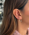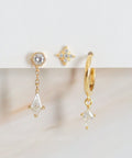 DESCRIZIONE: Tris orecchini singoli: orecchino con punto luce frontale e catena con zircone pendente a forma di rombo, orecchino di stella con zirconi, orecchino a cerchio con ciondolo a forma di rombo.