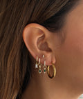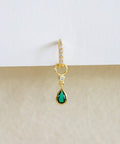 DESCRIZIONE:Orecchino a cerchietto con mini zirconi incastonati, ciondolo a forma di goccia nel colore verde smeraldo e mini punto luce , chiusura a cerniera