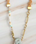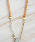 DESCRIZIONE:Collana con maglia ad uncinetto in colore camel, dettaglio di perline colorate laterale con madre perla a forma di croce, catena laterale e ciondolo in pietra Jaspe